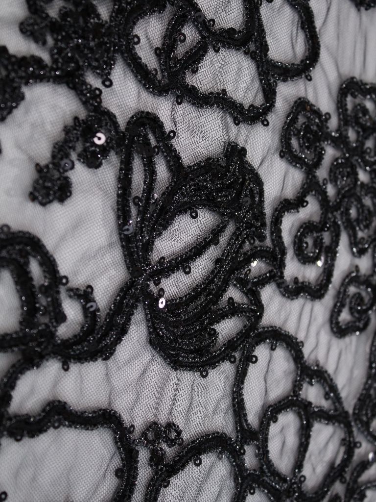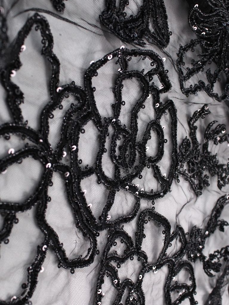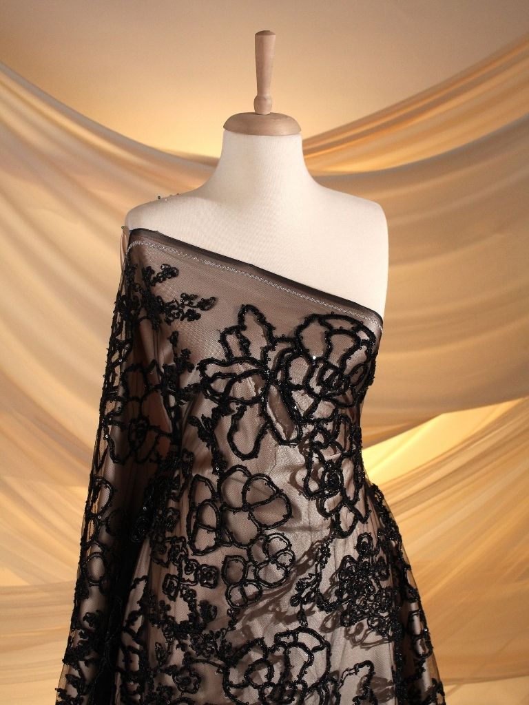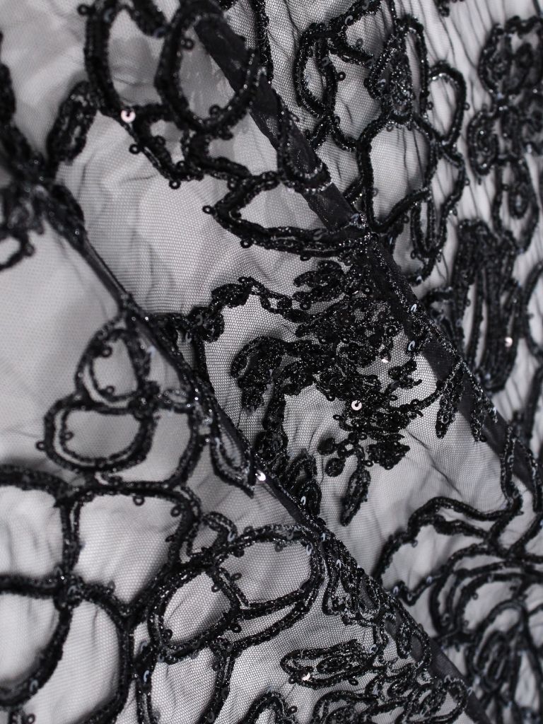 Black Tulle fabric adorned with floral embroidery
