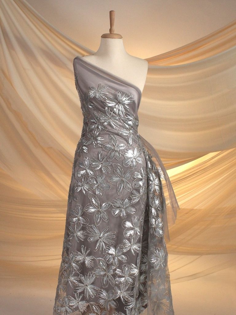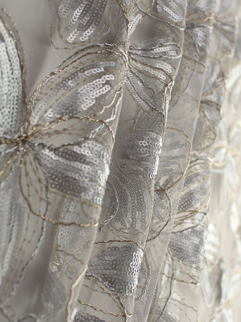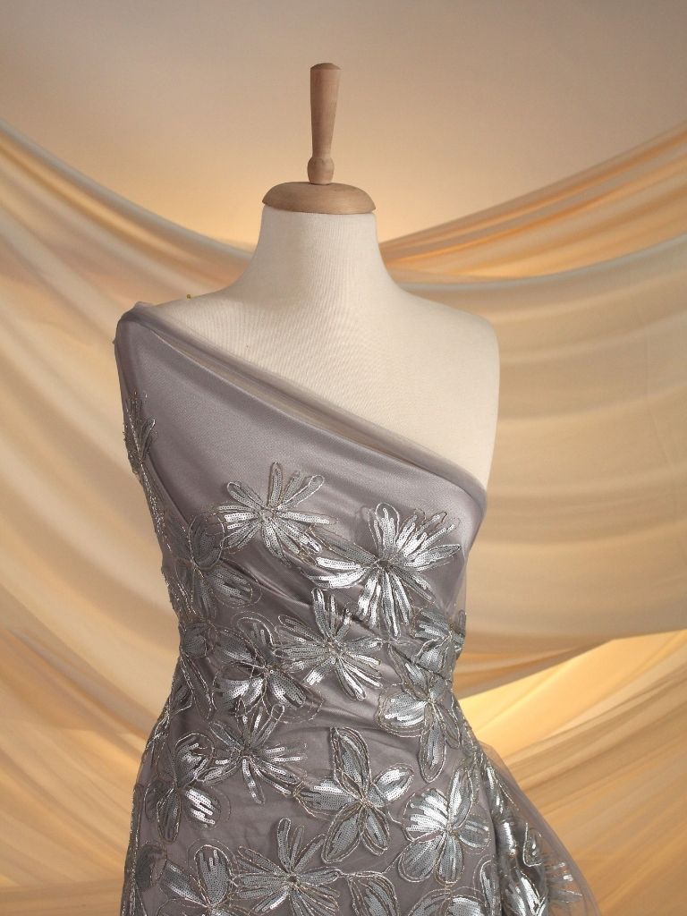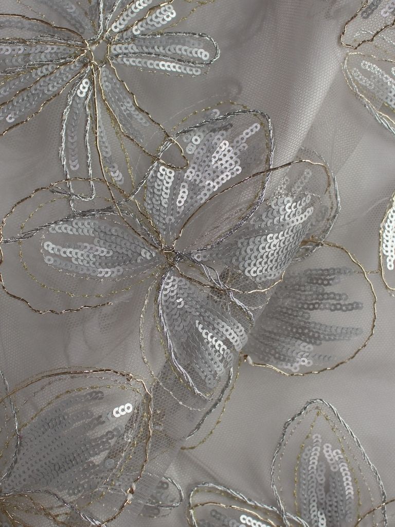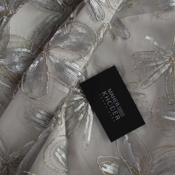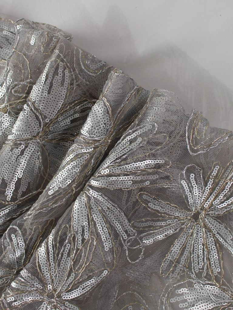 This exquisite dark brown tulle fabric is adorned with glamorous floral embroidery that creates a captivating pattern. The sheer tulle base adds a sophisticated texture. Moreover, The embroidery arranged a form of a delightful pattern, making this fabric perfect for designing gowns that combine elegance with a touch of glamour.