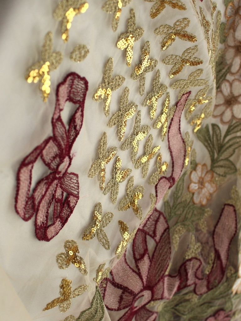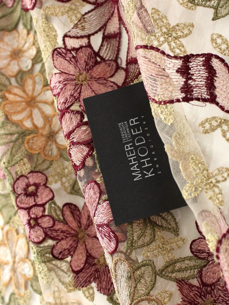 Light beige and burgundy coloured Tulle fabric adorned with floral embroidery