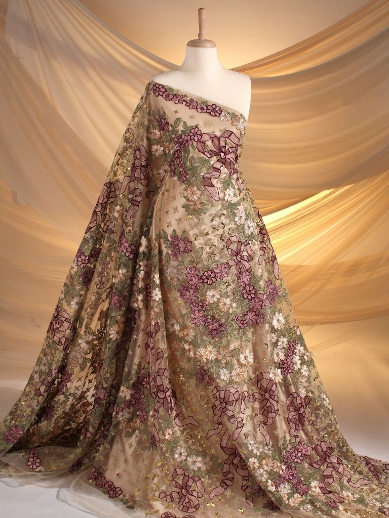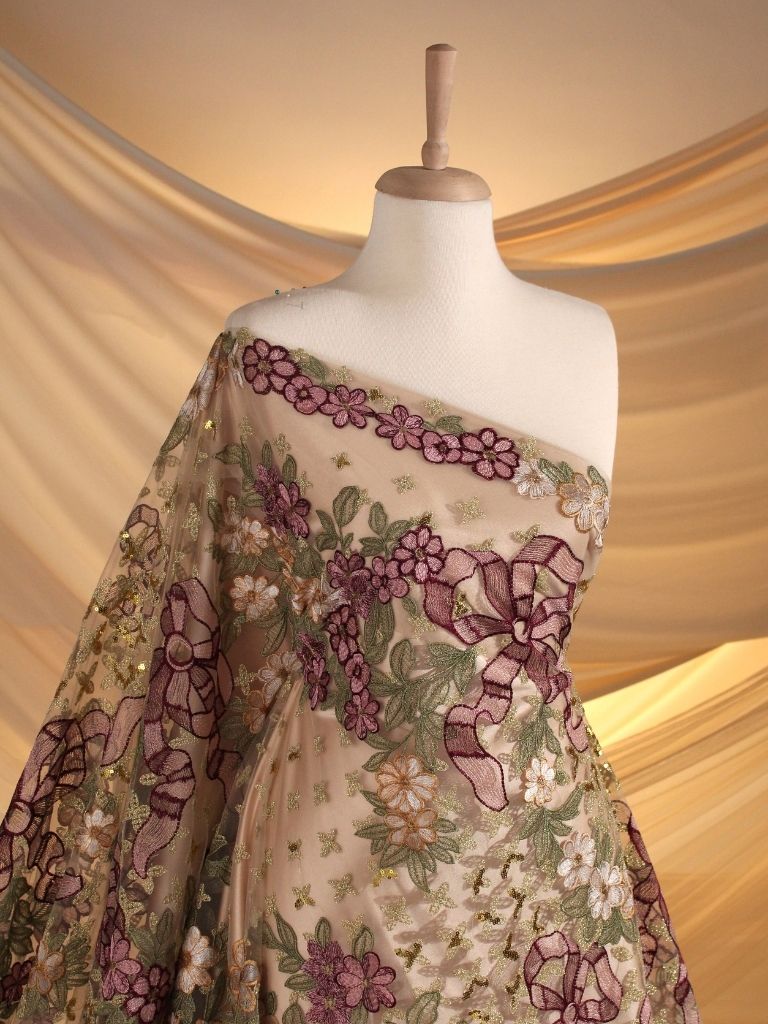 light beige and burgundy coloured tulle fabric featuring floral embroidery in a charming pattern. The embroidered floral threads on the fabric gives a splendid fabulous look. This fabric is perfect for crafting stylish dresses, skirts, and evening gowns.